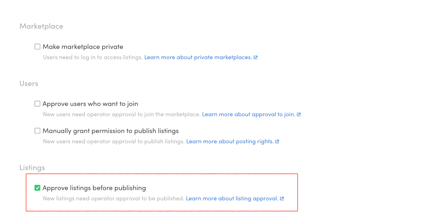 By default, listings in Sharetribe are published as soon as their author clicks the "publish" button. However, you can also set new listings to require approval before they are published. When the feature is enabled, new listings only get published once an operator has reviewed and approved them.