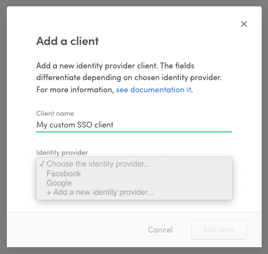 1. Go to the Social logins & SSO page in Console and click "+ Add new" to add a new identity provider client.