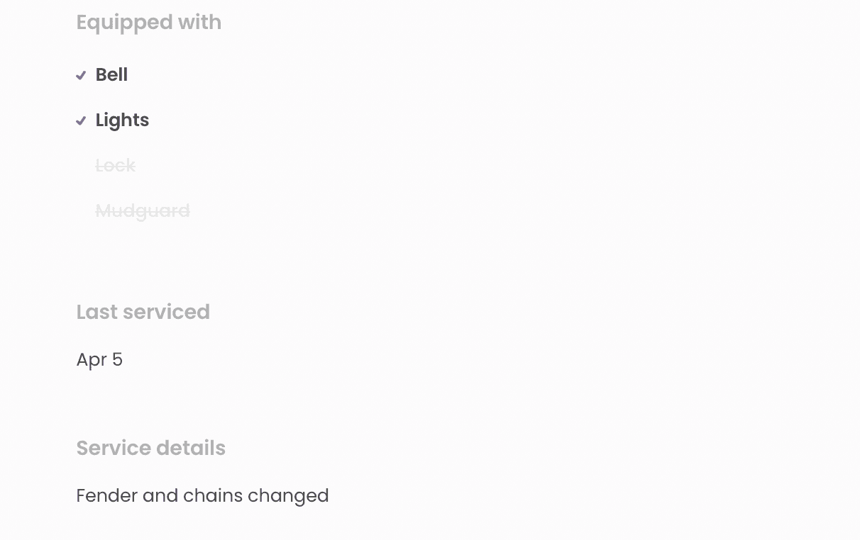 You may want to add more complex attributes as well. We will add an attribute lastServiced, which will be included in a listing selling the bike, and it will include the date of the last service of the bike as well as a description of what was serviced.