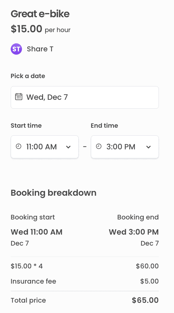 Now, if you open up a bookable listing page and select dates in the order panel on the right, the template will fetch line items and you will see an insurance fee row in the order breakdown: