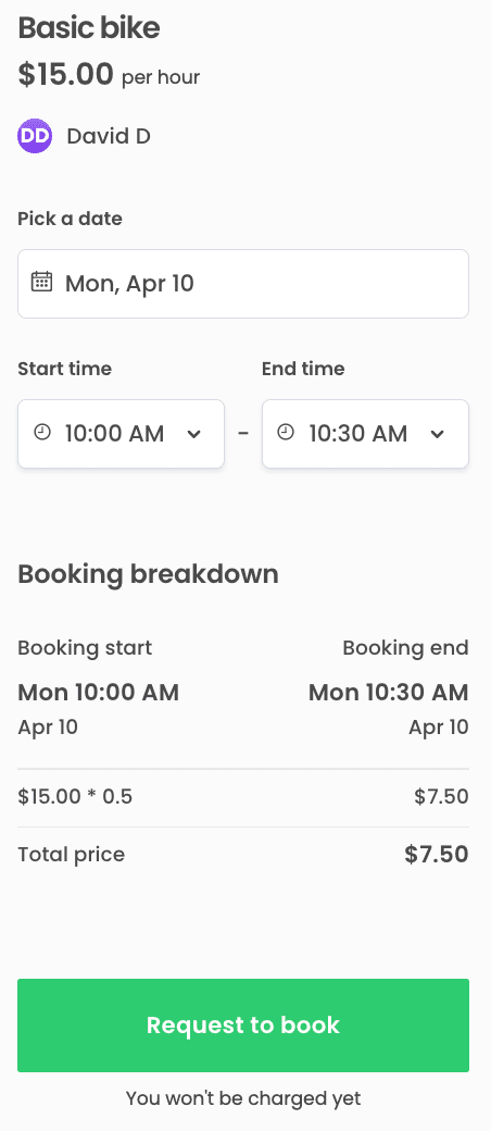 Sometimes, there are cases where you want to have a basic length for a booking and then different lengths for subsequent time slots. For instance, a listing could feature a 75 minute default bike rental with the option to extend it for 30 minutes at a time. In those cases, you need to create different handling for the first time slot, i.e. the first start and end boundaries.