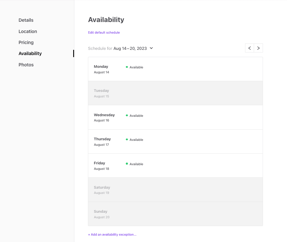 Sellers add their availability when creating their listing. Daily and nightly availability lets them add a default weekly schedule and easily set any exceptions to that default schedule. Hourly availability lets providers set their exact schedule for every day up to one year in advance.